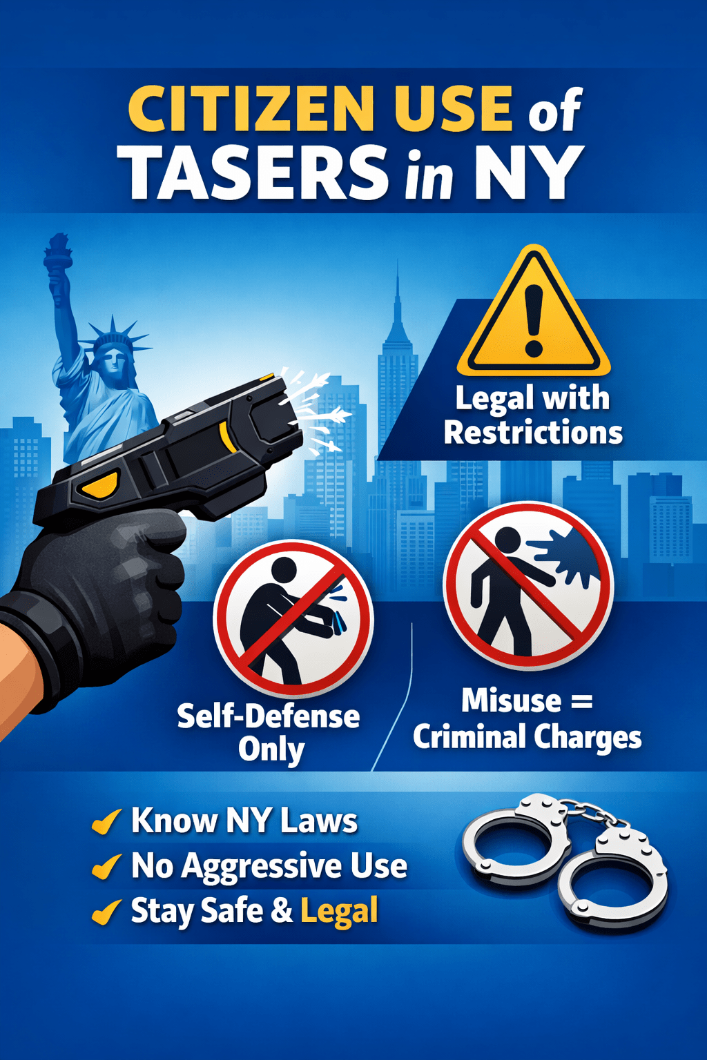 Citizen use of Tasers in NY infographic showing self-defense rules and legal restrictions.