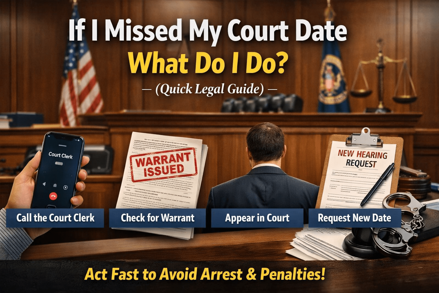 If i missed my court date what do i do, What Do I Need To Do — the first answer is: get a move on. Call the court, find out if there’s a bench warrant done and arrange to go in voluntarily before a civil matter devolves.” Failing to do so could result in arrest, fines or worse.
